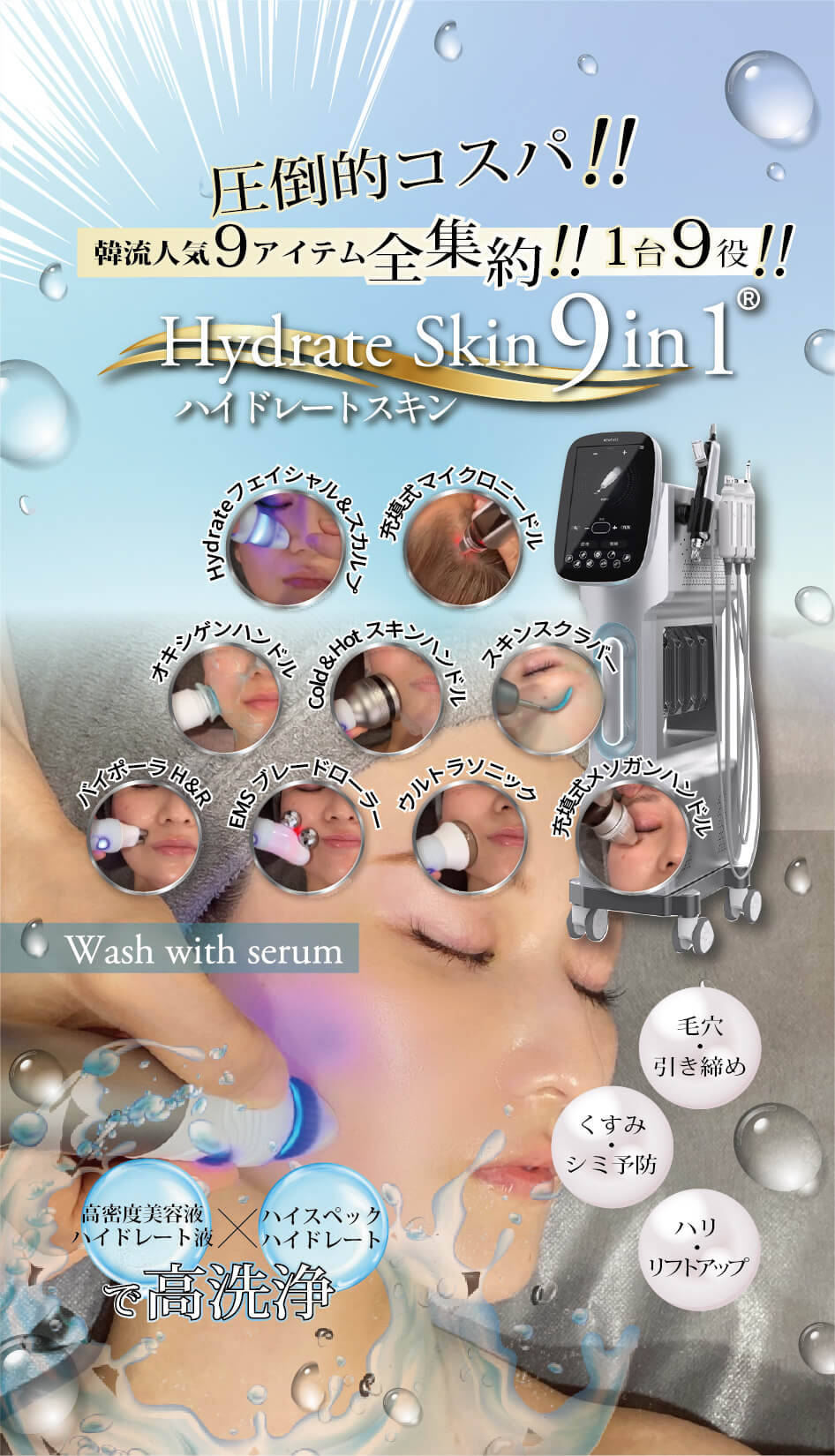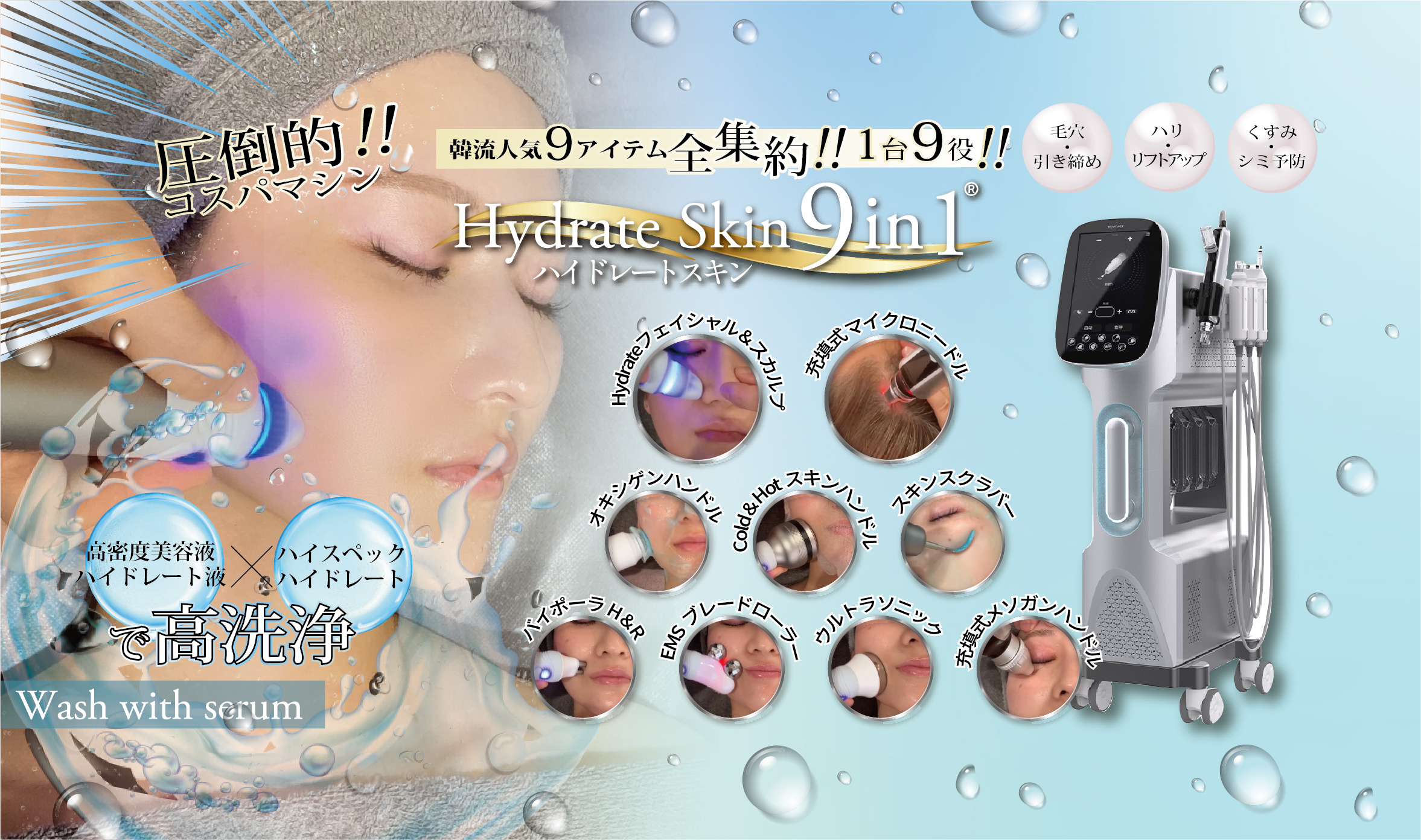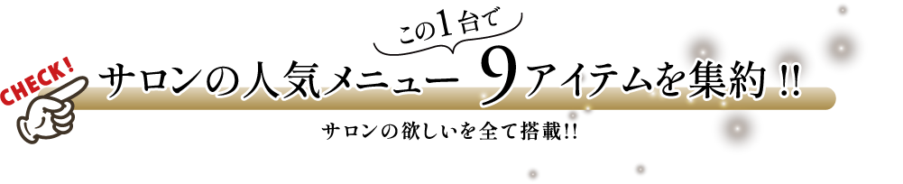 水素導入・EMS・冷却・超音波・メソガンなど9機能を1台で完結。各社別々の機器を揃える必要がなく、省スペース&高いコストパフォーマンスを実現しています。