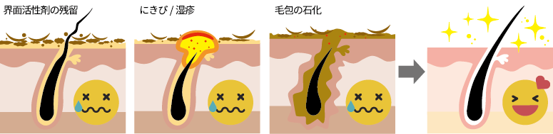 界面活性剤の残留が、頭皮から分泌される皮脂や角質と混ざり合って毛穴をふさぎます。シャンプーでは落としきれない汚れを一気にクリーンに!!